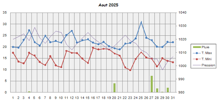 Température moyenne mensuelle : 18.2 °C Tx mensuelle : 25.4 °C le 11 - Tn mensuelle : 10.3 °C le 9 Vent moyen pour le mois : 7.1 km/h de secteur Ouest - Rafale maxi : 45.1 km/h Durée d'ensoleillement : 193 Heures Pluviometrie mensuelle : 27.8 mm avec un maximum journalier de 6.0 mm - 6jrs>2mm Avec ensoleillement >50% : 14jrs - Avec ensoleillement >80% : 6jrs Agréable (>=20°C): 28jrs - Chaleur (>=25°C): 2jrsMOIS D'AOUT