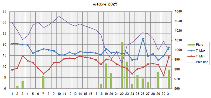 Température moyenne mensuelle : 16 °C Tx mensuelle : 26.6°C le 6 - Tn mensuelle : 6.9°C le 30 Vent moyen pour le mois : 6.9km/h de secteur Sud-ouest - Rafale maxi : 54.7km/h le 14 Durée d'ensoleillement : 169Heures Pluviometrie mensuelle : 115mm avec un maximum journalier de 79mm le 21 - 9jrs>2mm Avec ensoleillement >50% : 13jrs - Avec ensoleillement >80% : 2jrs Agréable (>=20°C): 13jrs - Chaleur (>=25°C): 1jrsMOIS D'OCTOBRE