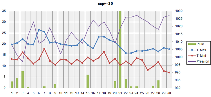Température moyenne mensuelle : 18.4 °C Tx mensuelle : 31°C le 25 - Tn mensuelle : 9.8°C le 23 Vent moyen pour le mois : 6km/h de secteur Nord-est - Rafale maxi : 43km/h Durée d'ensoleillement : 226Heures Pluviometrie mensuelle : 15.6mm avec un maximum journalier de 7mm le 27 - 3jrs>2mm Avec ensoleillement >50% : 20jrs - Avec ensoleillement >80% : 5jrs Agréable (>=20°C): 26jrs - Chaleur (>=25°C): 4jrs - Forte chaleur >30° : 1jrMOIS DE SEPTEMBRE